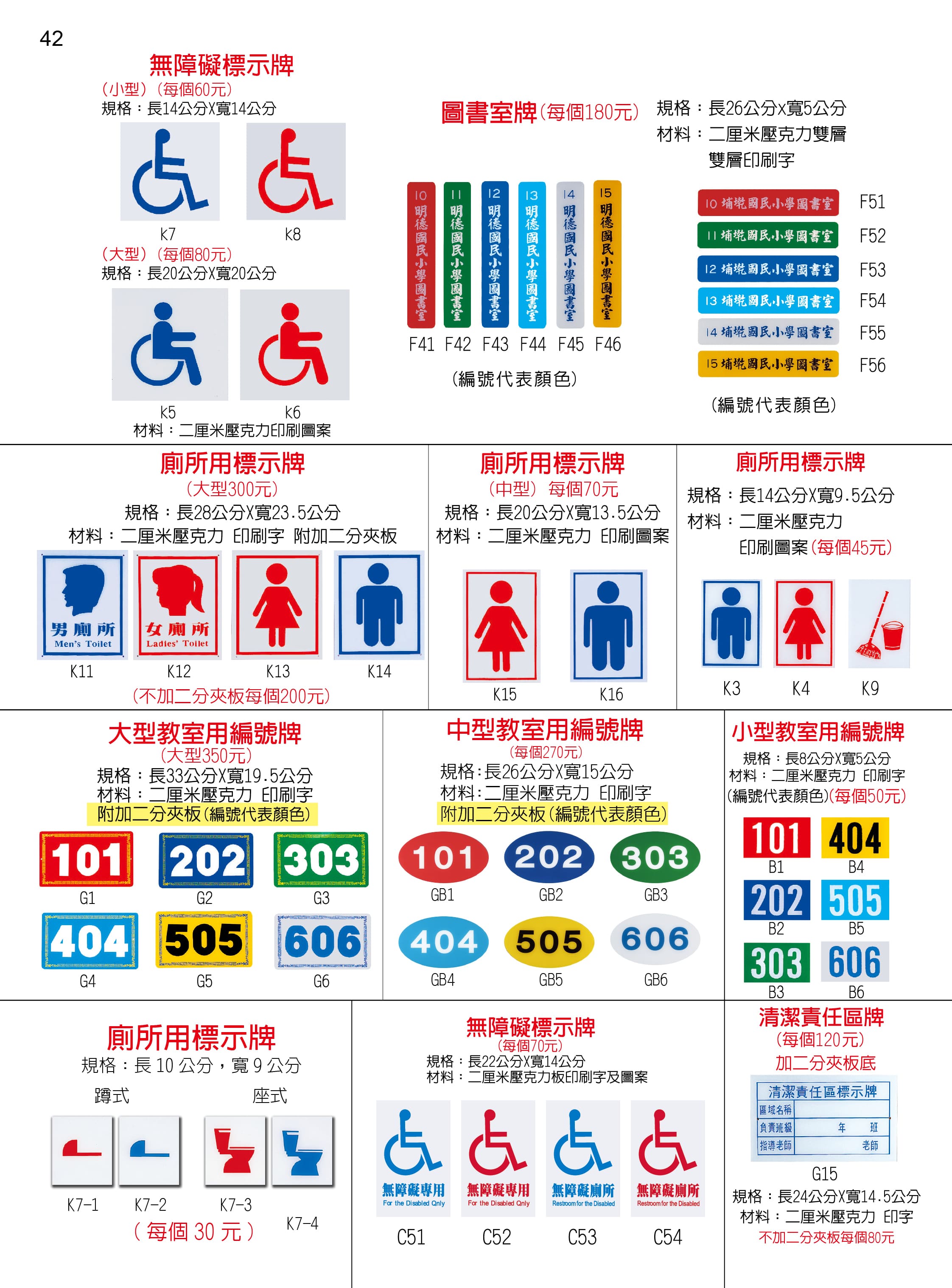 p42 (1)無障礙標示牌(2)圖書室牌(3)廁所標示牌(4)壓克力號碼編號牌(5)清潔責任區牌3