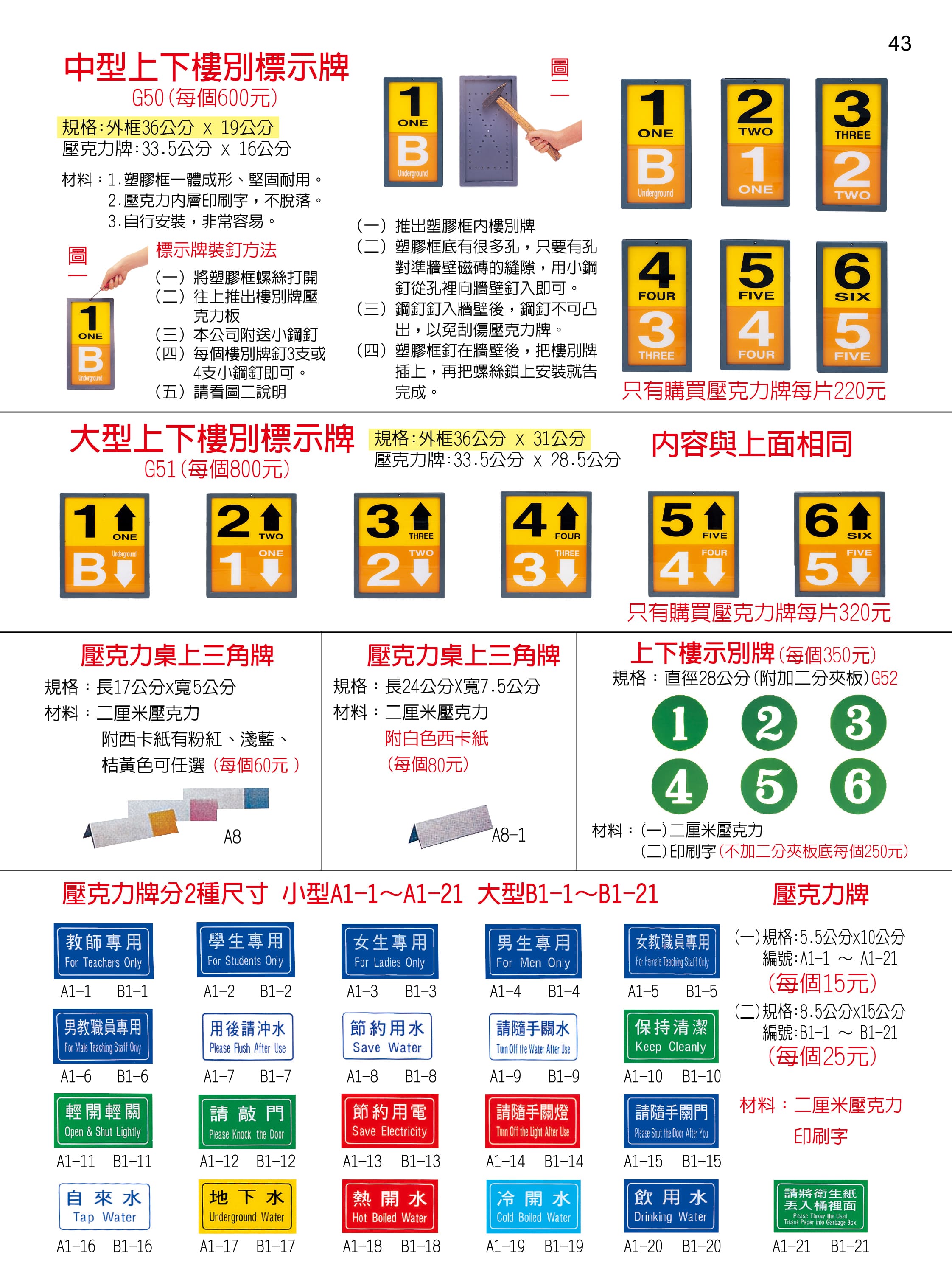 首頁 ﹥ 產品目錄 > p43 (1)大型中英文樓別牌(2)壓克力牌(3)中型中英文樓別牌(4)壓克力三角牌 觀看大圖 (1)大型中英文樓別牌(2)壓克力牌(3)中型中英文樓別牌(4)壓克力三角牌 (1)大型中英文樓別牌(2)壓克力牌(3)中型中英文樓別牌(4)壓克力三角牌