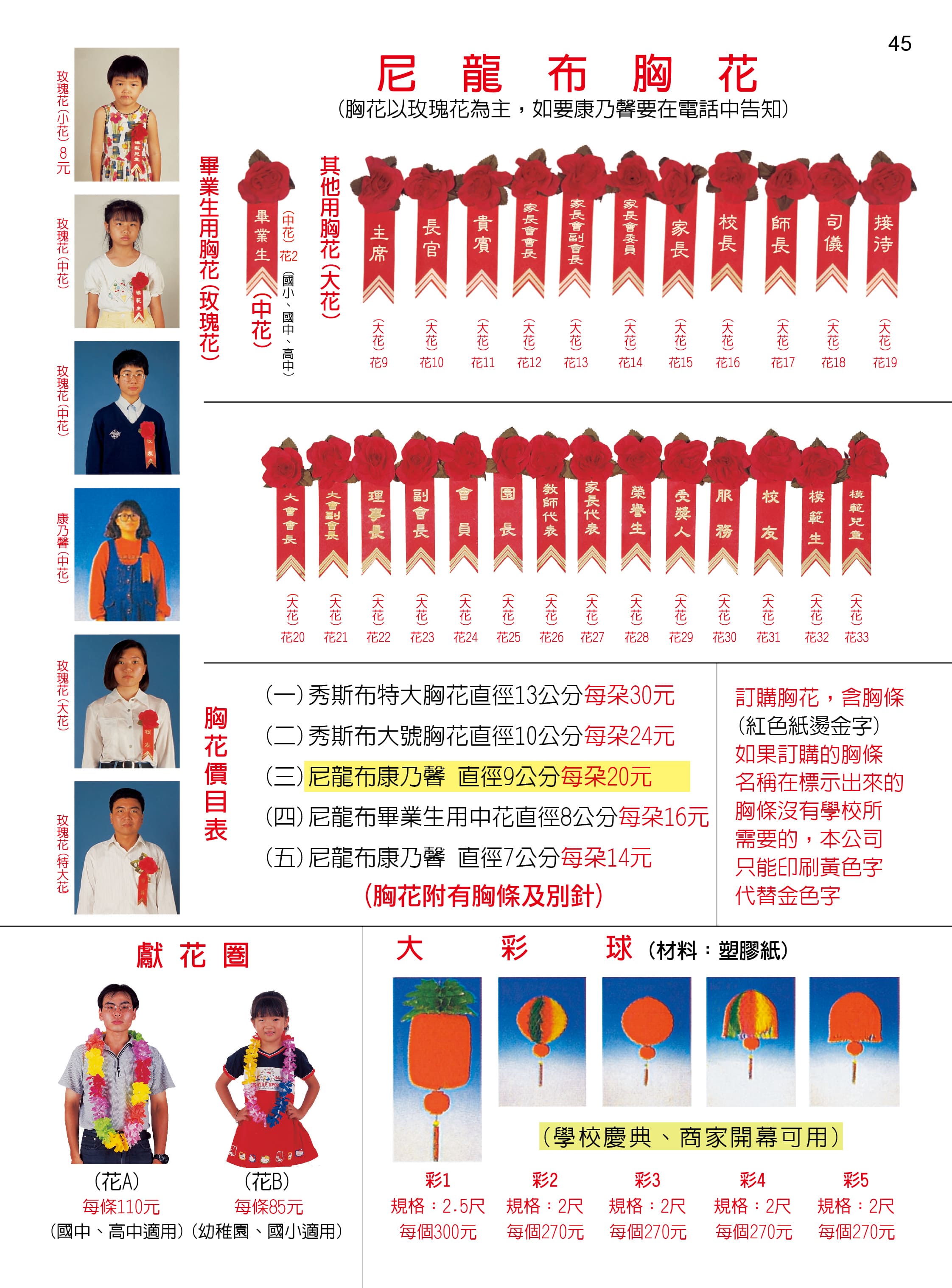 p45 (1)畢業生胸花(2)獻花圈(3)彩球