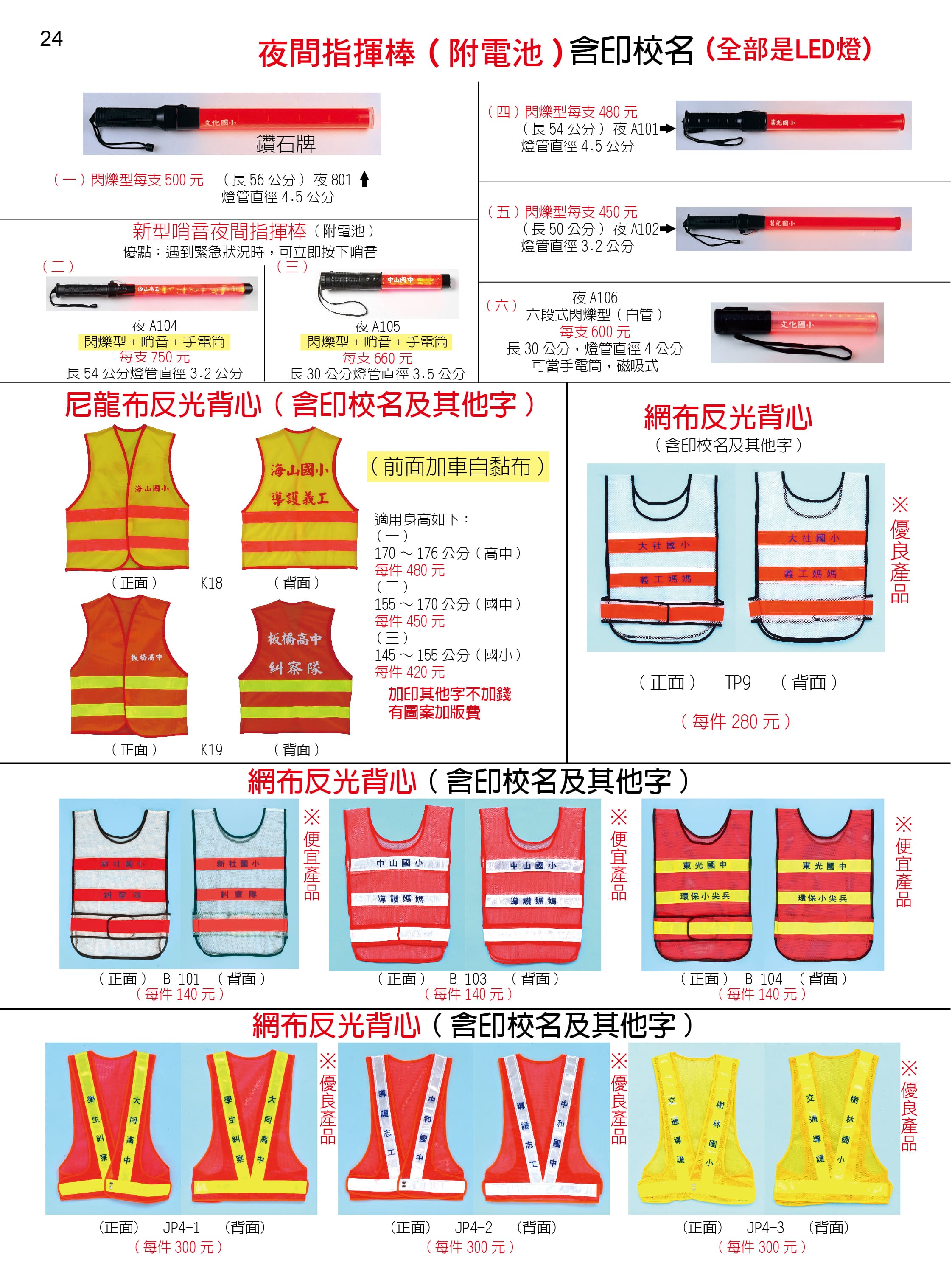 p19 (1)反光臂章(2)銅質教鞭型導護旗(3)反光旗(4)鋁質伸縮導護旗