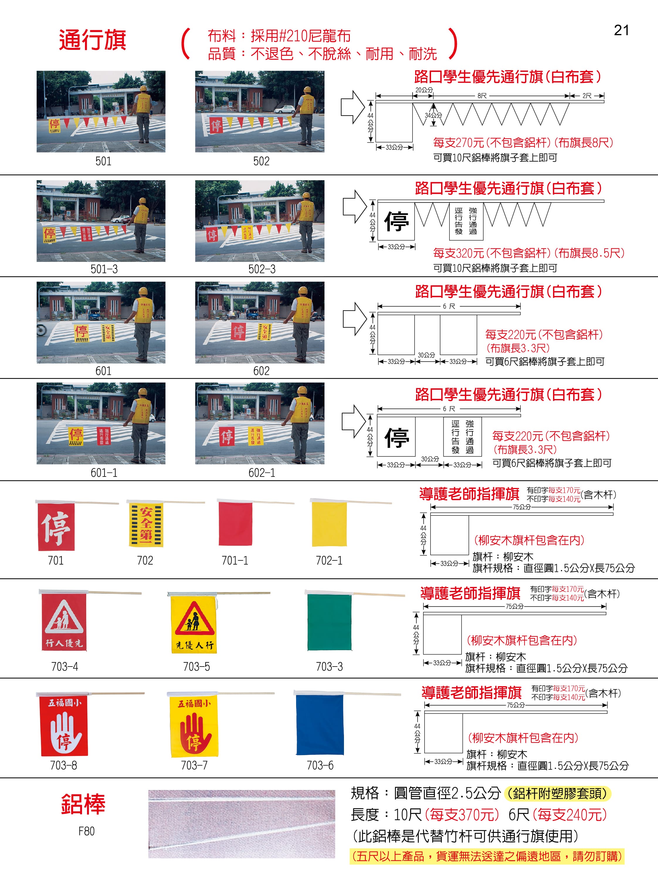 首頁 ﹥ 產品目錄 > p21 (1)各種通行旗(2)各種導護旗(3)通行旗用鋁杆(鋁棒) 觀看大圖 (1)各種通行旗(2)各種導護旗(3)通行旗用鋁杆(鋁棒) (1)各種通行旗(2)各種導護旗(3)通行旗用鋁杆(鋁棒)