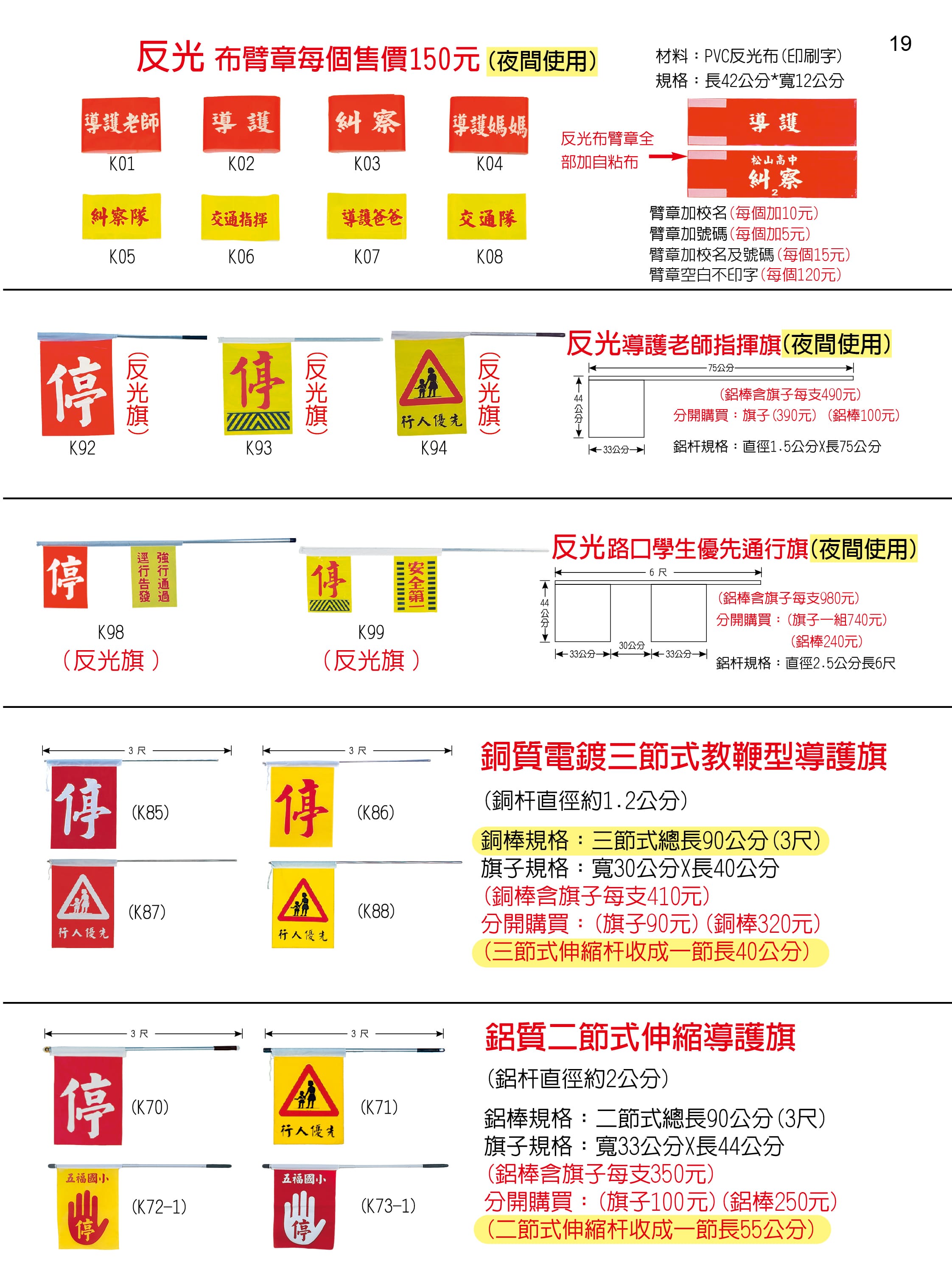 首頁 ﹥ 產品目錄 > p19 (1)反光臂章(2)銅質教鞭型導護旗(3)反光旗(4)鋁質伸縮導護旗 觀看大圖 (1)反光臂章(2)銅質教鞭型導護旗(3)反光旗(4)鋁質伸縮導護旗 (1)反光臂章(2)銅質教鞭型導護旗(3)反光旗(4)鋁質伸縮導護旗