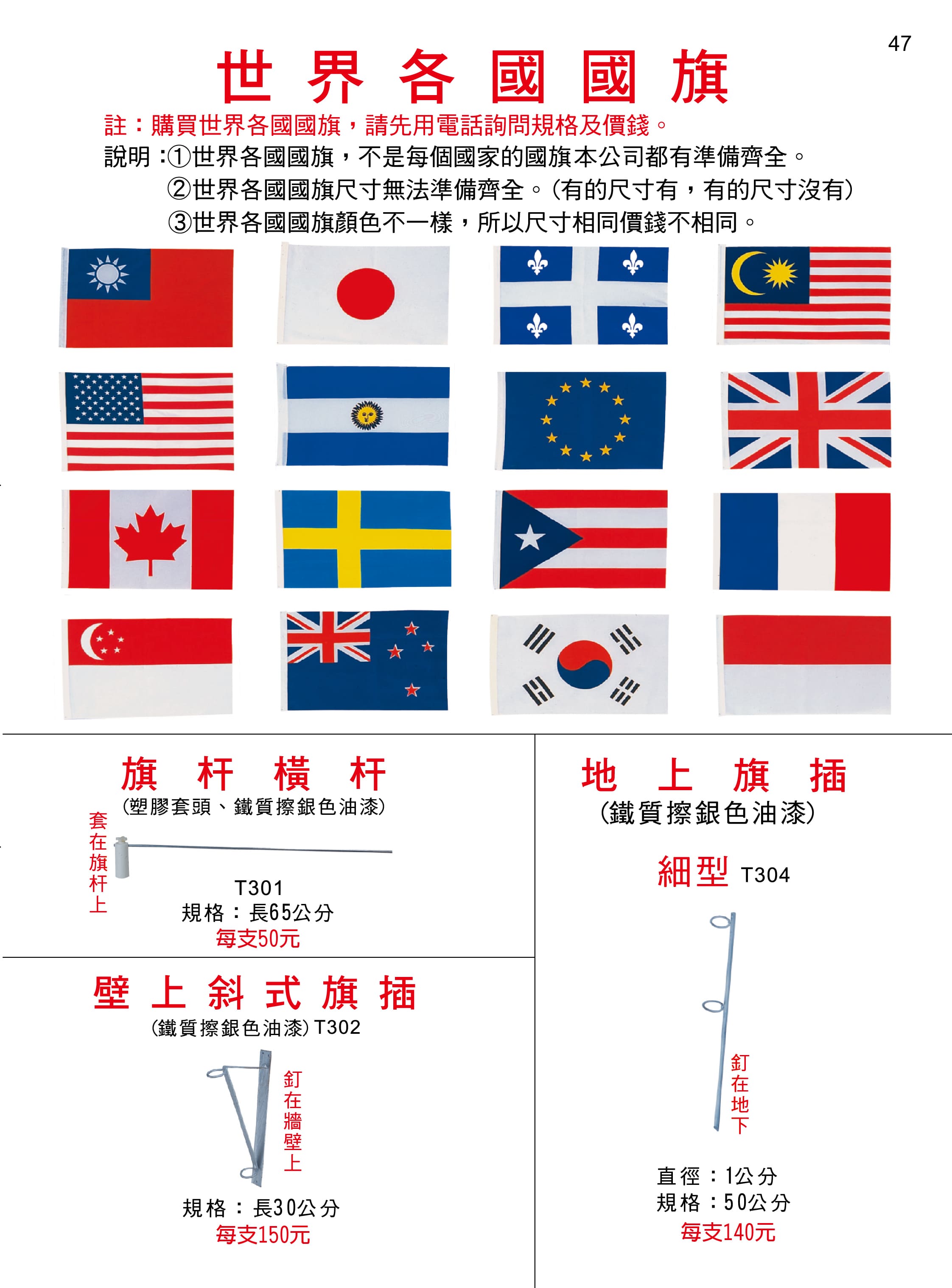 (1)世界各國國旗(2)直式旗用橫杆(3)壁上斜式旗插(4)地上旗插