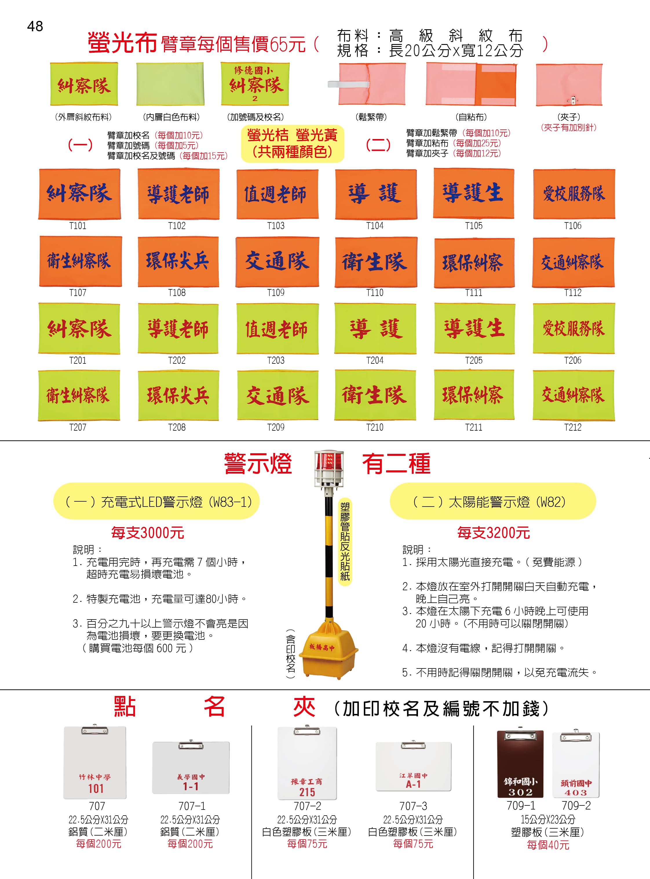 (1)充電式及太陽能警示燈(2)點名夾(3)螢光布臂章